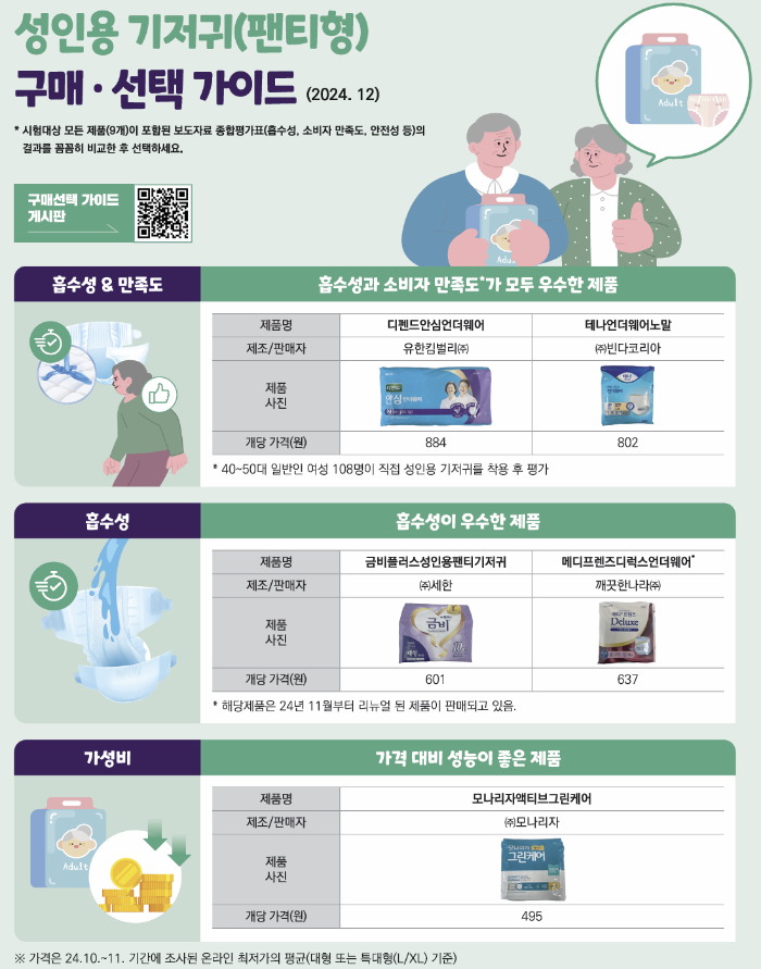 안녕하세요, 오늘은 성인용 기저귀(팬티형)에 대한 구매 가이드를 소개해드리려고 합니다. 한국소비자원에서 실시한 품질비교 시험 결과를 바탕으로, 소비자 여러분께 최고의 제품을 추천해 드리겠습니다.